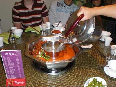 Po niedzielnych lekcjach poszliśmy (całe 14 osób) na huoguo. Zasady były jasne - mówimy tylko po chińsku i nie używamy łyżek nawet w najbardziej krytycznych sytuacjach. Biorąc pod uwagę, że połowa żarcia była nieprawdopodobnie śliska, nie dziwi, że jeden Francuz musiał błagać o pomoc...