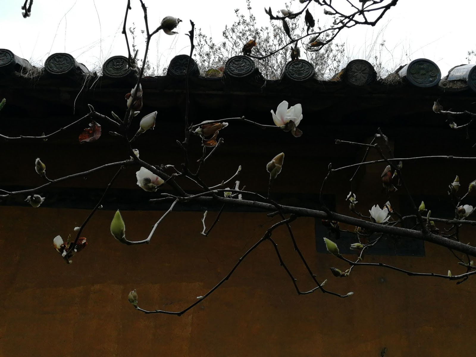 | Magnolie rozkwitłe nad posągiem Yuan Jiagu. |