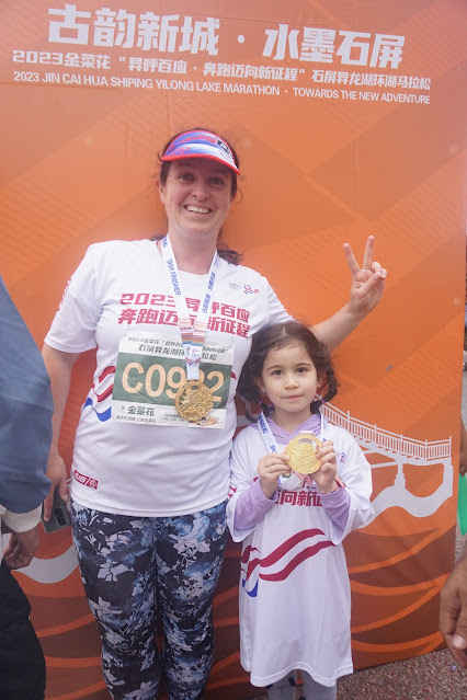 Nigdy nigdzie nie jeździmy na majówkę, ponieważ wszędzie wtedy pełno ludzi, a w dodatku hotele nagle krzyczą trzykrotnie wyższe ceny. Tym razem jednak miałyśmy z Tajfuniątkiem wziąć udział w wyścigu, więc spakowałyśmy co tam trzeba i wsiadłyśmy w autokar zarezerwowany dla "zagranicznych gości" z Kunmingu, który w jakieś cztery godziny dowiózł nas na miejsce. Najpierw udaliśmy się do punktu startowego maratonu, żeby podpisem potwierdzić uczestnictwo i żeby odebrać komplet prezentów od organizatorów: